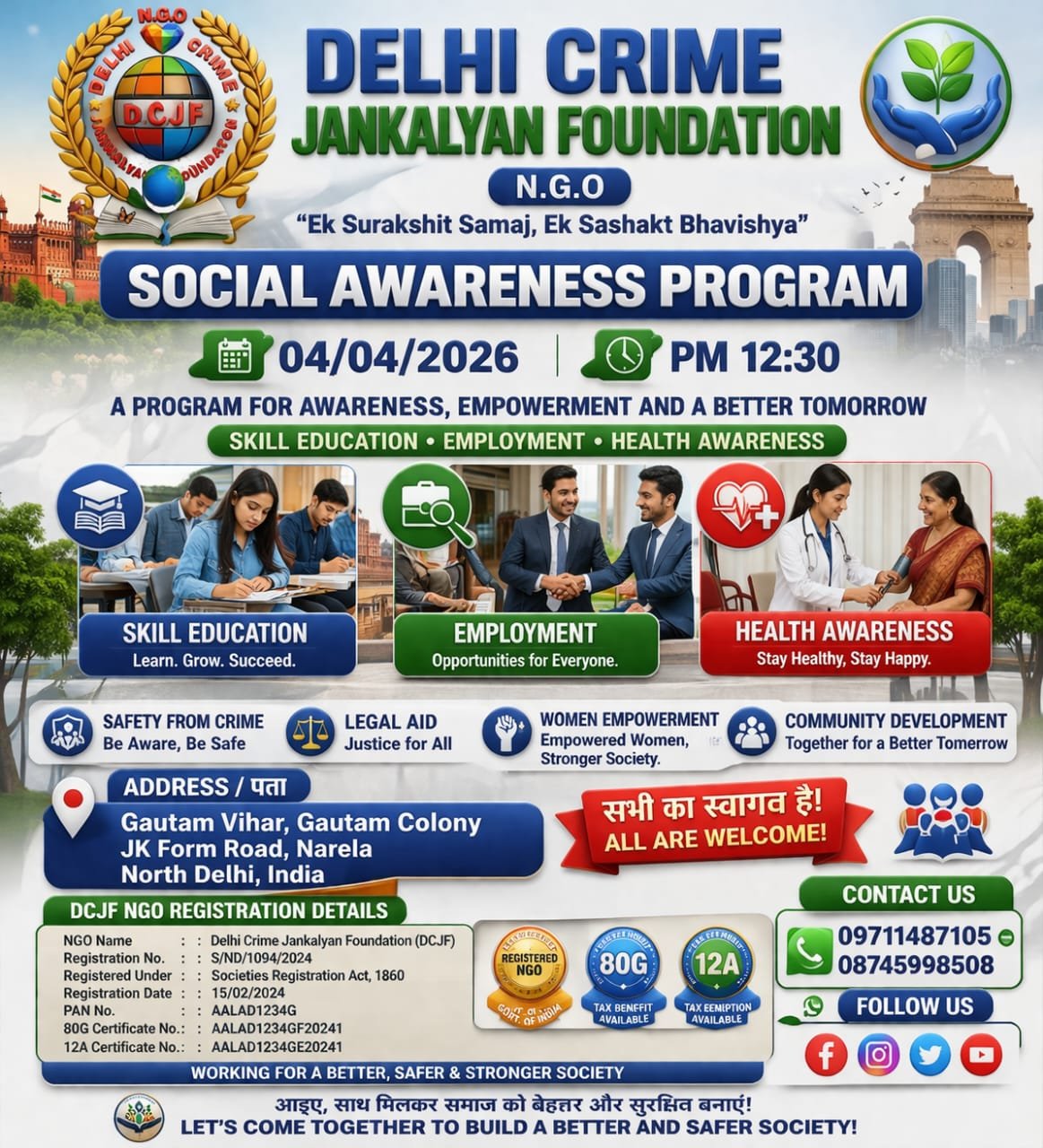 Education center per program company avenance education skill employment health welfare activity ЁЯУД рдХрд╛рд░реНрдпрдХреНрд░рдо рд╕реВрдЪрдирд╛ / Event Program ЁЯПв Delhi Crime Jankalyan Foundation (DCJF NGO) (Government Registered Social Welfare Organization) ЁЯУв рд╡рд┐рд╢реЗрд╖ рдЖрдордВрддреНрд░рдг – рд╕рдорд╛рдЬ рдХрд▓реНрдпрд╛рдг рдХрд╛рд░реНрдпрдХреНрд░рдо рдЖрдк рд╕рднреА рдХреЛ рд╕реВрдЪрд┐рдд рдХрд┐рдпрд╛ рдЬрд╛рддрд╛ рд╣реИ рдХрд┐ Delhi Crime Jankalyan Foundation NGO рджреНрд╡рд╛рд░рд╛ рдПрдХ рд╡рд┐рд╢реЗрд╖ рд╕рдорд╛рдЬ рдХрд▓реНрдпрд╛рдг рдПрд╡рдВ рдЬрд╛рдЧрд░реВрдХрддрд╛ рдХрд╛рд░реНрдпрдХреНрд░рдо рдХрд╛ рдЖрдпреЛрдЬрди рдХрд┐рдпрд╛ рдЬрд╛ рд░рд╣рд╛ рд╣реИред ЁЯУН рдХрд╛рд░реНрдпрдХреНрд░рдо рд╡рд┐рд╡рд░рдг (Event Details) ЁЯУМ рд╕реНрдерд╛рди (Location): рдЧреМрддрдо рд╡рд┐рд╣рд╛рд░ рдкреБрдирд░реНрд╡рд╛рд╕, рдЧреМрддрдо рдХреЙрд▓реЛрдиреА, рдирд░реЗрд▓рд╛, рдиреЙрд░реНрде рд╡реЗрд╕реНрдЯ рджрд┐рд▓реНрд▓реА – 110040, рднрд╛рд░рдд ЁЯУЕ рджрд┐рдирд╛рдВрдХ (Date): 04 рдЕрдкреНрд░реИрд▓ 2026 тП░ рд╕рдордп (Time): рджреЛрдкрд╣рд░ 12:30 рдмрдЬреЗ рд╕реЗ 04:00 рдмрдЬреЗ рддрдХ ЁЯТ░ рдЕрдиреБрдорд╛рдирд┐рдд рдмрдЬрдЯ: тВ╣11000ЁЯСе рд▓рд╛рднрд╛рд░реНрдереА (Beneficiaries): 260 рдорд╣рд┐рд▓рд╛рдПрдВ рдПрд╡рдВ рдЖрдо рдЬрди ЁЯОп рдХрд╛рд░реНрдпрдХреНрд░рдо рдХреЗ рдореБрдЦреНрдп рдЙрджреНрджреЗрд╢реНрдп рд╕рдорд╛рдЬ рдореЗрдВ рд╢рд┐рдХреНрд╖рд╛ (Education) рдХреЛ рдмрдврд╝рд╛рд╡рд╛ рджреЗрдирд╛ рдпреБрд╡рд╛рдУрдВ рдХреЗ рд▓рд┐рдП Skill Development & Employment Guidance рд╕реНрд╡рд╛рд╕реНрдереНрдп рдЬрд╛рдЧрд░реВрдХрддрд╛ (Health Awareness) рдлреИрд▓рд╛рдирд╛ рдЧрд░реАрдм рдПрд╡рдВ рдЬрд░реВрд░рддрдордВрдж рд▓реЛрдЧреЛрдВ рдХреЛ рдЦрд╛рджреНрдп рд╕рд╛рдордЧреНрд░реА (Food Distribution) рдкреНрд░рджрд╛рди рдХрд░рдирд╛ рдорд╣рд┐рд▓рд╛рдУрдВ рдХреЛ рдЖрддреНрдордирд┐рд░реНрднрд░ рдмрдирд╛рдиреЗ рдХреЗ рд▓рд┐рдП рдкреНрд░реЗрд░рд┐рдд рдХрд░рдирд╛ ЁЯЫая╕П рдХрд╛рд░реНрдпрдХреНрд░рдо рдХреА рдореБрдЦреНрдп рдЧрддрд┐рд╡рд┐рдзрд┐рдпрд╛рдБ ЁЯФ╣ 1. рд╢рд┐рдХреНрд╖рд╛ рдПрд╡рдВ рдорд╛рд░реНрдЧрджрд░реНрд╢рди рдмрдЪреНрдЪреЛрдВ рдХреЗ рд▓рд┐рдП рд╢рд┐рдХреНрд╖рд╛ рдЬрд╛рдЧрд░реВрдХрддрд╛ рдХрд░рд┐рдпрд░ рдПрд╡рдВ рд░реЛрдЬрдЧрд╛рд░ рдорд╛рд░реНрдЧрджрд░реНрд╢рди ЁЯФ╣ 2. рд╕реНрдХрд┐рд▓ рдбреЗрд╡рд▓рдкрдореЗрдВрдЯ рд╕рд┐рд▓рд╛рдИ, рдХрдВрдкреНрдпреВрдЯрд░ рдПрд╡рдВ рдЕрдиреНрдп рд░реЛрдЬрдЧрд╛рд░ рдкреНрд░рд╢рд┐рдХреНрд╖рдг рдЬрд╛рдирдХрд╛рд░реА рд╕реНрд╡рд░реЛрдЬрдЧрд╛рд░ рдХреЗ рдЕрд╡рд╕рд░реЛрдВ рдкрд░ рдЪрд░реНрдЪрд╛ ЁЯФ╣ 3. рд╕реНрд╡рд╛рд╕реНрдереНрдп рдЬрд╛рдЧрд░реВрдХрддрд╛ рд╕реНрд╡рдЪреНрдЫрддрд╛ рдПрд╡рдВ рд╕реНрд╡рд╛рд╕реНрдереНрдп рд╕рдВрдмрдВрдзреА рдЬрд╛рдирдХрд╛рд░реА рдорд╣рд┐рд▓рд╛рдУрдВ рдПрд╡рдВ рдмрдЪреНрдЪреЛрдВ рдХреЗ рд╕реНрд╡рд╛рд╕реНрдереНрдп рдкрд░ рд╡рд┐рд╢реЗрд╖ рд╕рддреНрд░ ЁЯФ╣ 4. рдлреВрдб рдбрд┐рд╕реНрдЯреНрд░реАрдмреНрдпреВрд╢рди рдЬрд░реВрд░рддрдордВрдж рдкрд░рд┐рд╡рд╛рд░реЛрдВ рдХреЛ рд░рд╛рд╢рди рд╡рд┐рддрд░рдг рдкреЛрд╖рдг рд╕рд╛рдордЧреНрд░реА рд╡рд┐рддрд░рдг ЁЯСйЁЯСз рд╡рд┐рд╢реЗрд╖ рдлреЛрдХрд╕ (Special Focus) 260 рдорд╣рд┐рд▓рд╛рдУрдВ рдХреЛ рдЬрд╛рдЧрд░реВрдХ рдПрд╡рдВ рд╕рд╢рдХреНрдд рдмрдирд╛рдирд╛ рдЧрд░реАрдм рдПрд╡рдВ рд╡рдВрдЪрд┐рдд рдкрд░рд┐рд╡рд╛рд░реЛрдВ рддрдХ р