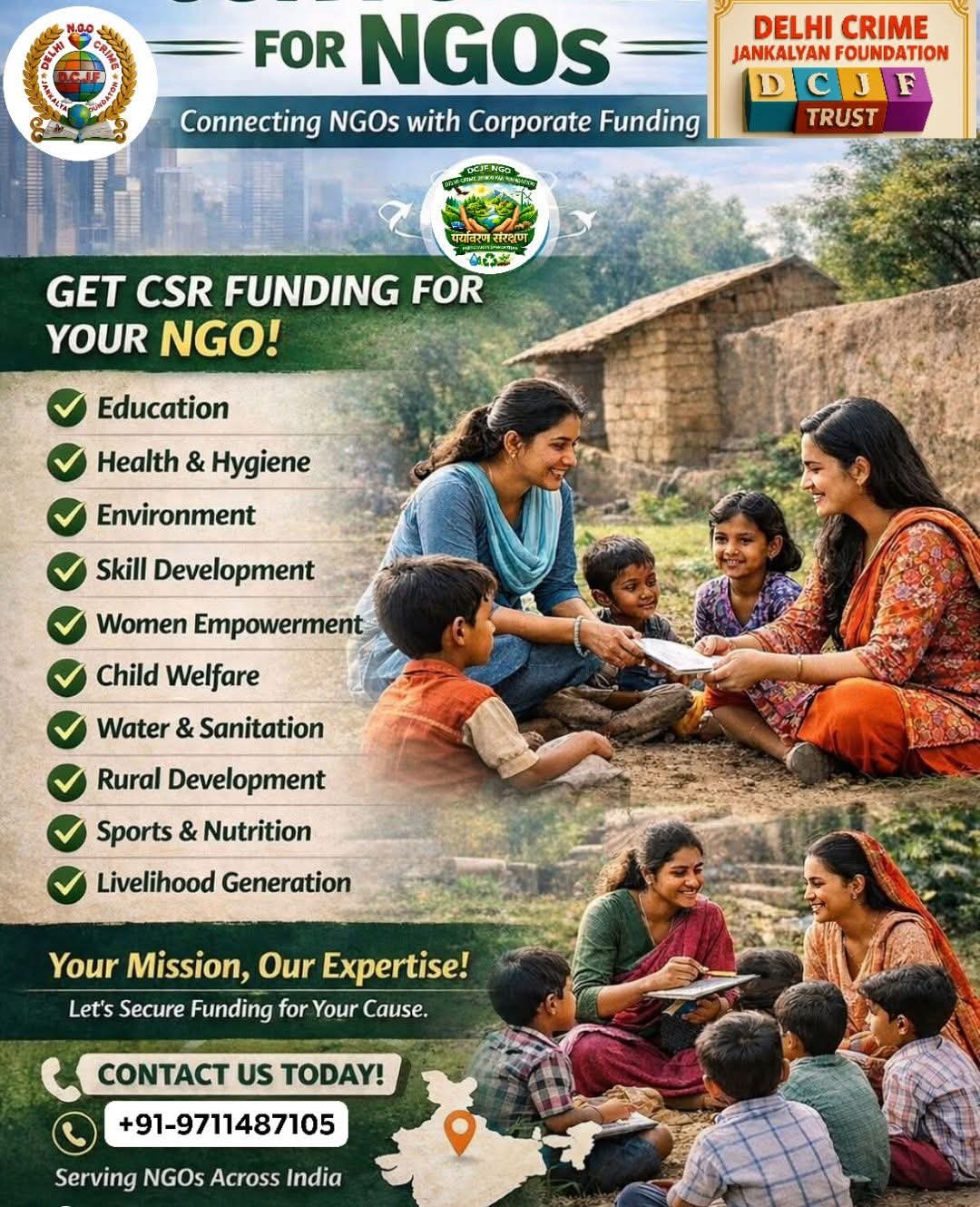 Delhi Crime Jankalyan Foundation (DCJF) देशभर में समाज कल्याण, शिक्षा, स्वास्थ्य, कौशल विकास, महिला सशक्तिकरण और रोजगार सहायता हेतु सक्रिय है। वर्तमान में NGO की गतिविधियाँ निम्नलिखित क्षेत्रों में संचालित हो रही हैं: